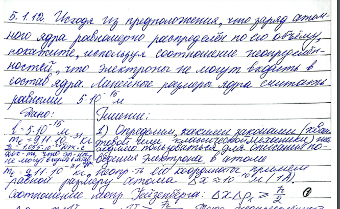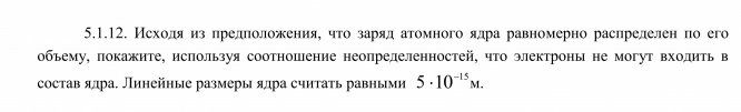 5.1.12. Исходя из предположения, что заряд атомного ядра равномерно распределен по его объему, покажите, используя соотношение неопределенностей, что электроны не могут входить в состав ядра. Линейные размеры ядра считать равными 5 15 10 м.