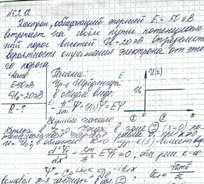 5.2.12. Электрон, обладающий энергией E = 50 эВ, встречает на своем пути потенциальный порог высотой U = 20 эВ. Определите вероятность отражения электрона от этого порога.