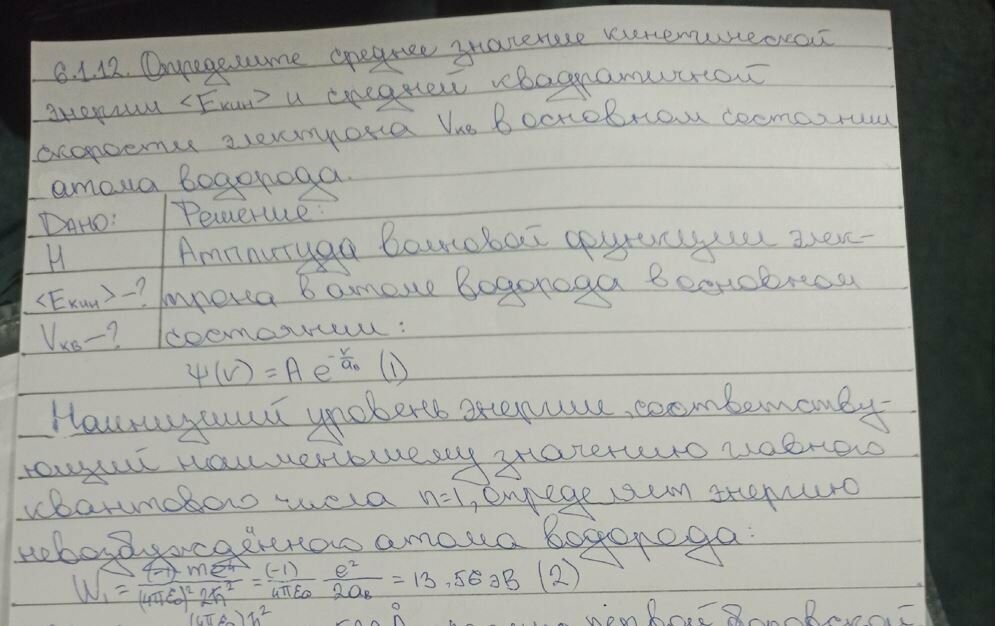 6.1.12. Определите среднее значение кинетической энергии  E кин  и средней квадратичной скорости электрона кв v в основном состоянии атома водорода.
