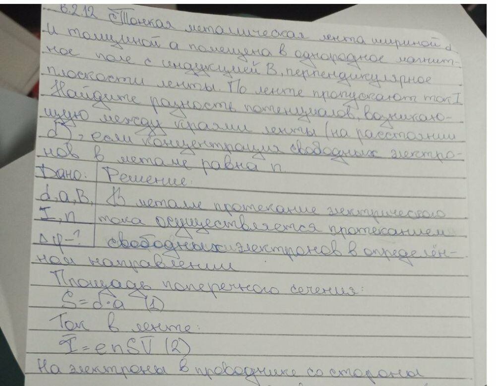 6.2.12. Тонкая металлическая лента шириной d и толщиной a помещена в однородное магнитное поле с индукцией B , перпендикулярное плоскости ленты. По ленте пропускают ток I . Найдите разность потенциалов, возникающую между краями ленты (на расстоянии d ), если концентрация свободных электронов в металле равна n .