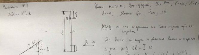Сразу после удара стержень вращается с угловой скоростью 0, а шарик приобретает скорость и продолжает двигаться в плоскости рисунка. Другие обозначения: