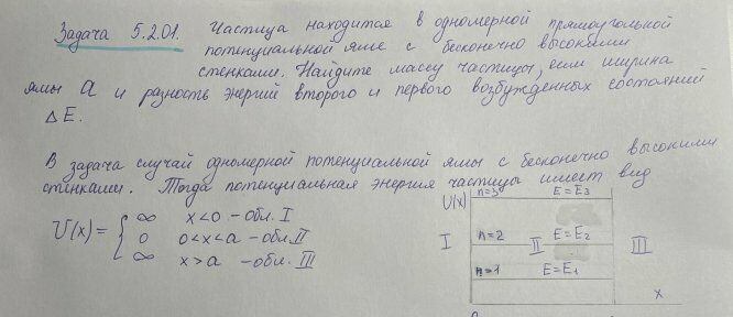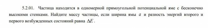 5.2.01. Частица находится в одномерной прямоугольной потенциальной яме с бесконечно высокими стенками. Найдите массу частицы, если ширина ямы a и разность энергий второго и первого возбужденных состояний равна E .5.2.01. Частица находится в одномерной прямоугольной потенциальной яме с бесконечно высокими стенками. Найдите массу частицы, если ширина ямы a и разность энергий второго и первого возбужденных состояний равна E .