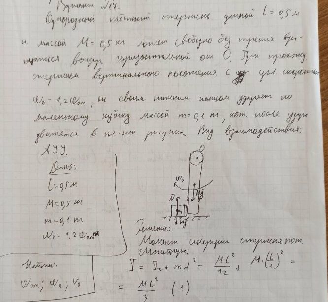 0m – угловая скорость стержня сразу после взаимодействия с кубиком, при условии, что