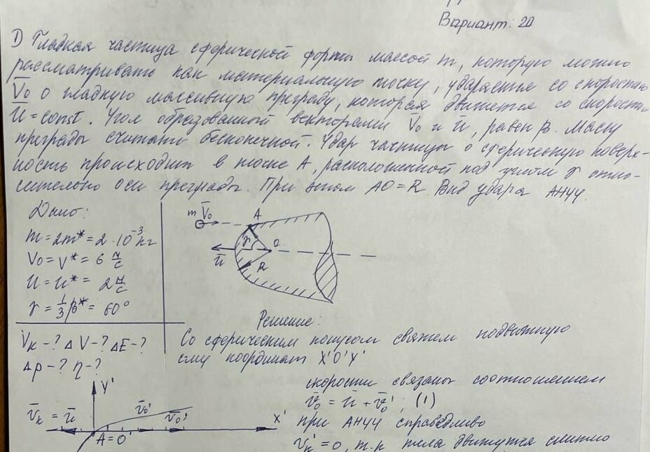 Гладкая частица сферической формы массой m, которую можно рассматривать как материальную точку, ударяется со скоростью о гладкую массивную преграду, которая движется со скоростью . Угол, образованный векторами и , равен . Массу преграды считать бесконечной. На рис. 5, 6 преграда имеет форму плоской стенки, на рис.7 – форму острого конуса с углом раствора γ, а на рис. 8 – форму конуса сферической головной частью радиусом R. Удар частицы о сферическую поверхность происходит в точке А, расположенной под углом γ относительно оси преграды. При этом АО = R. Виды взаимодействия: а) абсолютно упругий удар (АУУ); б) неупругий удар (НУУ); в) абсолютно неупругий удар (АНУУ).