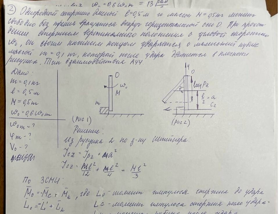 Обозначения: - конечная скорость частицы после удара; αк - угол, образованный векторами и ; - изменение вектора скорости частицы за время удара; - изменение модуля импульса частицы за время удара; ΔE - изменение кинетической энергии частицы за время удара; F - модуль средней силы, с которой частица действует на стенку во время удара; F.Δt - модуль импульса силы, который за время удара Δt частица передаёт стенке; - энергия деформирования частицы при ударе, выраженная через её начальную кинетическую энергию, где - безразмерный коэффициент. Однородный жёсткий стержень длиной l=0,5 м и массой М=0,5 кг может свободно без трения вращаться вокруг горизонтальной оси О.