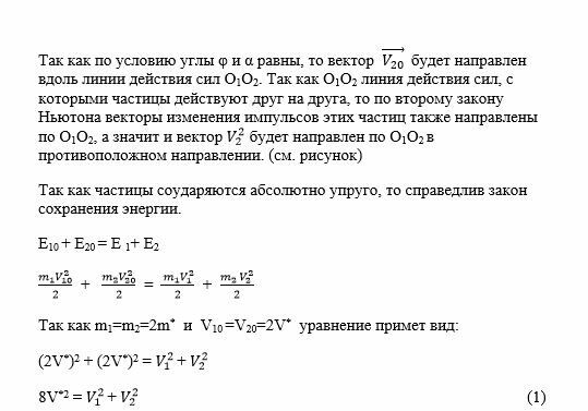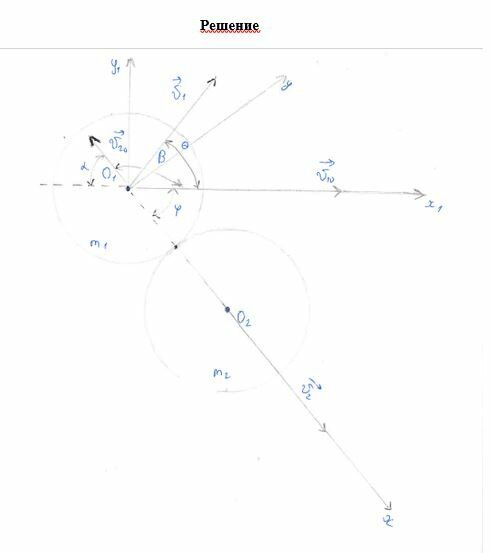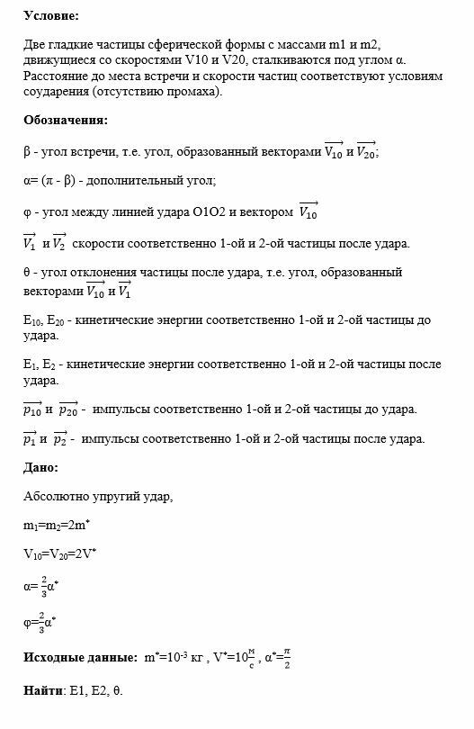 Две гладкие частицы сферической формы с массами m1 и m2, движущиеся со скоростями   и  , сталкиваются под углом b, как указано на рис.1. Расстояние до места встречи и скорости частиц соответствуют условиям соударения (отсутствию промаха). b - угол встречи, т.е. угол, образованный векторами  и   ;a = (p - b) - дополнительный угол;j - угол между линией удара O1O2 и вектором   .Другие обозначения:  и   - скорости соответственно 1-ой и 2-ой частицы после удара.  -  совместная скорость частиц после абсолютно неупругого удара. q - угол отклонения частицы после удара, т.е. угол, образованный векторами  и  или   и  g - угол разлета частиц после удара, т.е. угол, образованный векторами  и  .