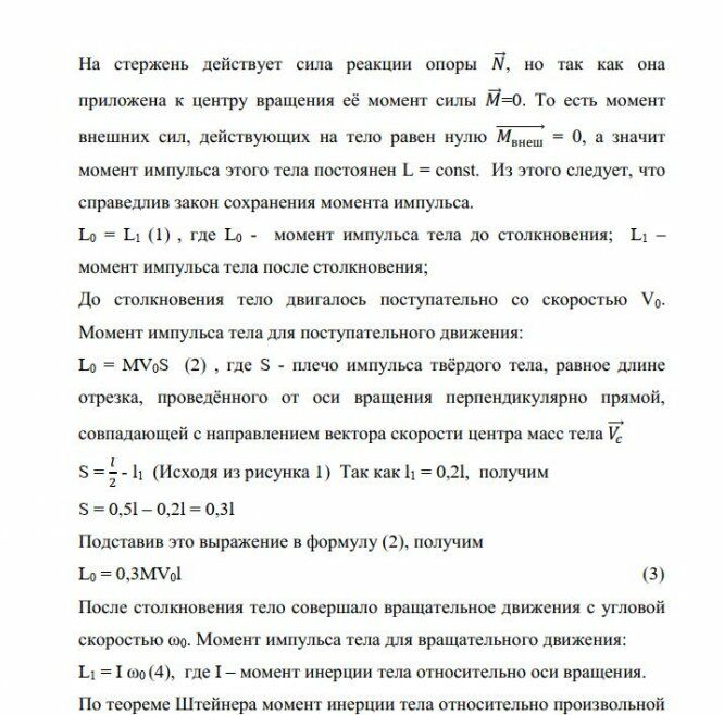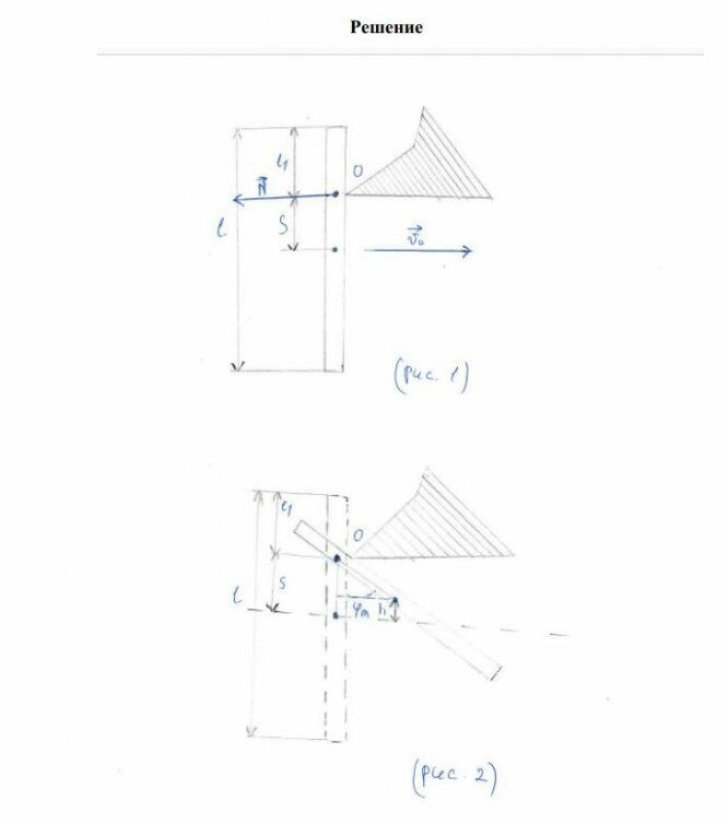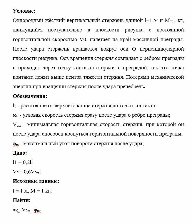 Ось вращения стержня совпадает с ребром преграды и проходит через точку контакта стержня с преградой, так что точка контакта лежит выше центра тяжести стержня (рис. 14). Потерями механической энергии при вращении стержня после удара пренебречь.Другие обозначения:l1 – расстояние от верхнего конца стержня до точки контакта;ω0 – угловая скорость стержня сразу после удара о ребро преграды;V0m – минимальная горизонтальная скорость стержня, а ω0m – соответственно минимальная угловая скорость стержня, при которой он после удара способен коснуться горизонтальной поверхности преграды;φm – максимальный угол поворота стержня после удара; ωК – угловая скорость стержня в момент его удара о горизонтальную поверхность преграды.