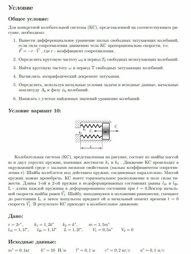 Каждая колебательная система (КС), представленная на рис. 28, 29, 30, 31, состоит из шайбы массой m и двух упругих пружин, имеющих жесткости k1 и k2 . Движение КС происходит в окружающей среде с малыми вязкими свойствами (малым коэффициентом сопротивления r). На рис. 28, 30 шайба колеблется под действием пружин, соединенных параллельно, а на рис. 29, 31 колебания происходят под действием пружин, соединенных последовательно. Массой пружин можно пренебречь. На рис. 28, 29 КС имеет горизонтальное расположение, а на рис. 30, 31 вертикальное расположение в поле силы тяжести. Длины 1-ой и 2-ой пружин в недеформированных состояниях равны l10 и l20. На рис.28, 30 L - длина каждой пружины в деформированном состоянии при t=0. На рис.29, 31 L - общая длина двух пружин в деформированном состоянии при t=0. Возможные векторы начальной скорости шайбы равны V1, V2. Шайбу, находящуюся в положении равновесия, смещают до расстояния L, а затем импульсом придают ей в начальный момент времени t=0 скорость V1 или V2, в соответствии с заданием (см. таблицы №10 - 13). В результате КС приходит в колебательное движение.