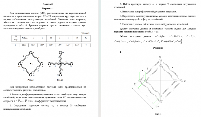 Для механических систем (МС), расположенных на горизонтальной плоскости и представленных на рис. 22 – 25, определить круговую частоту и период собственных незатухающих колебаний. Значения масс шариков, жёсткость соединяющих их пружин, а также другие исходные данные приведены в табл. 8. Трением шариков при их движении о контактную горизонтальную плоскость пренебречь. Для конкретной колебательной системы (КС), представленной на соответствующем рисунке, необходимо: 1. Вывести дифференциальное уравнение малых свободных затухающих колебаний, если сила сопротивления движению тела КС пропорциональна скорости, т.е., где r - коэффициент сопротивления. 2. Определить круговую частоту  и период T 0  свободных незатухающих колебаний.