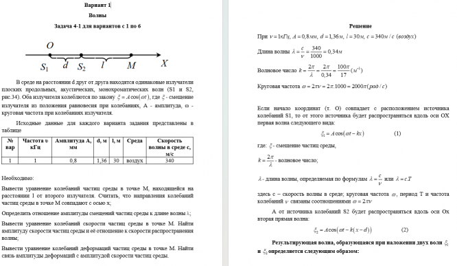 Исходные данные для каждого варианта задания представлены в таблице  № вар Частота  υ кГц Амплитуда А, мм d, м l, м Среда Скорость волны в среде с, м/с 1 1 0,8 1,36 30 воздух 340   Необходимо: Вывести уравнение колебаний частиц среды в точке М, находящейся на расстоянии l от второго излучателя. Считать, что направления колебаний частиц среды в точке М совпадают с осью x; Определить отношение амплитуды смещений частиц среды к длине волны l; Вывести уравнение колебаний скорости частиц среды в точке М. Найти амплитуду скорости частиц среды и её отношение к скорости распространения волны; Вывести уравнение колебаний деформаций частиц среды в точке М. Найти связь амплитуды деформаций с амплитудой скорости частиц среды..