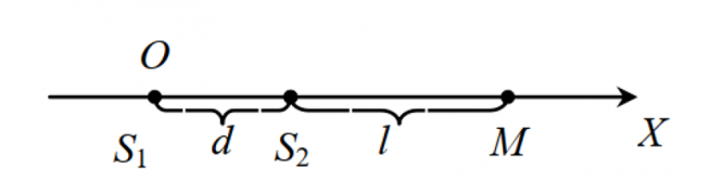 Вывести уравнение колебаний частиц среды в точке М, находящейся на расстоянии l от второго излучателя. Считать, что направления колебаний частиц среды в точке М совпадают с осью x;
