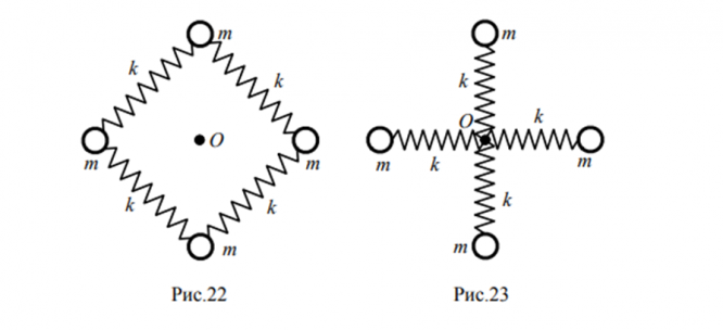 Для механических систем (МС), расположенных на горизонтальной плоскости и представленных на рис. 22 – 25, определить круговую частоту и период собственных незатухающих колебаний. Значения масс шариков, жёсткость соединяющих их пружин, а также другие исходные данные приведены в табл. 8. Трением шариков при их движении о контактную горизонтальную плоскость пренебречь.