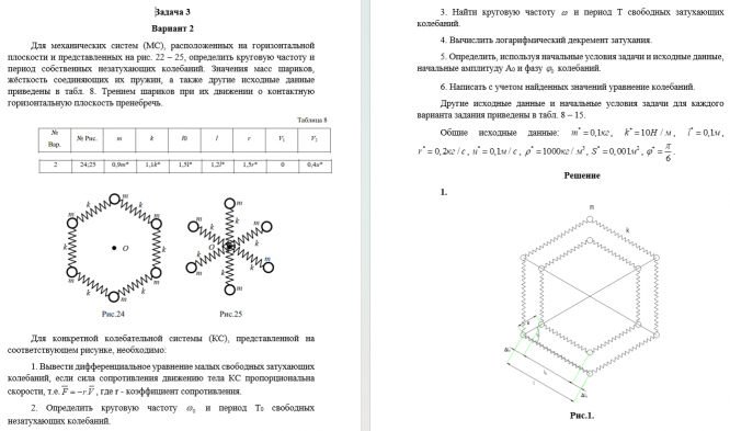 Задача 3 Вариант 2 Для механических систем (МС), расположенных на горизонтальной плоскости и представленных на рис. 22 – 25, определить круговую частоту и период собственных незатухающих колебаний. Значения масс шариков, жёсткость соединяющих их пружин, а также другие исходные данные приведены в табл. 8. Трением шариков при их движении о контактную горизонтальную плоскость пренебречь. Для конкретной колебательной системы (КС), представленной на соответствующем рисунке, необходимо: 1. Вывести дифференциальное уравнение малых свободных затухающих колебаний, если сила сопротивления движению тела КС пропорциональна скорости, т.е., где r - коэффициент сопротивления.