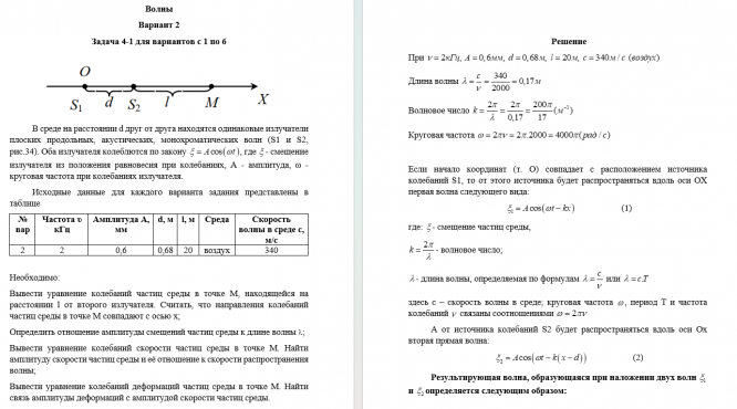 Оба излучателя колеблются по закону , где - смещение излучателя из положения равновесия при колебаниях, A - амплитуда, ω - круговая частота при колебаниях излучателя. Исходные данные для каждого варианта задания представлены в таблице  № вар Частота  υ кГц Амплитуда А, мм d, м l, м Среда Скорость волны в среде с, м/с 2 2 0,6 0,68 20 воздух 340   Необходимо: Вывести уравнение колебаний частиц среды в точке М, находящейся на расстоянии l от второго излучателя. Считать, что направления колебаний частиц среды в точке М совпадают с осью x; Определить отношение амплитуды смещений частиц среды к длине волны l; Вывести уравнение колебаний скорости частиц среды в точке М.