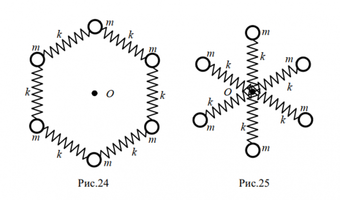 Для механических систем (МС), расположенных на горизонтальной плоскости и представленных на рис. 22 – 25, определить круговую частоту и период собственных незатухающих колебаний. Значения масс шариков, жёсткость соединяющих их пружин, а также другие исходные данные приведены в табл. 8. Трением шариков при их движении о контактную горизонтальную плоскость пренебречь.