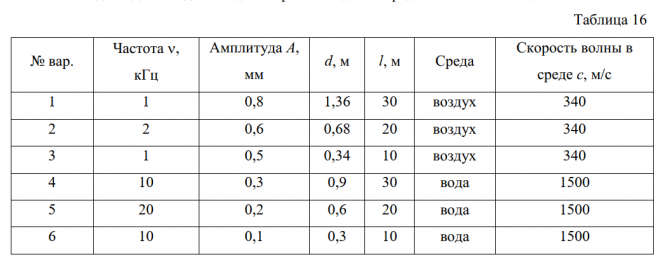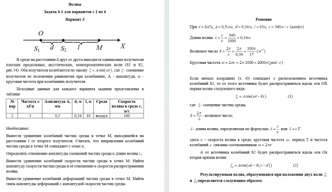 Оба излучателя колеблются по закону , где - смещение излучателя из положения равновесия при колебаниях, A - амплитуда, ω - круговая частота при колебаниях излучателя. Исходные данные для каждого варианта задания представлены в таблице  № вар Частота  υ кГц Амплитуда А, мм d, м l, м Среда Скорость волны в среде с, м/с 2 1 0,5 0,34 10 воздух 340   Необходимо: Вывести уравнение колебаний частиц среды в точке М, находящейся на расстоянии l от второго излучателя. Считать, что направления колебаний частиц среды в точке М совпадают с осью x; Определить отношение амплитуды смещений частиц среды к длине волны l; Вывести уравнение колебаний скорости частиц среды в точке М.