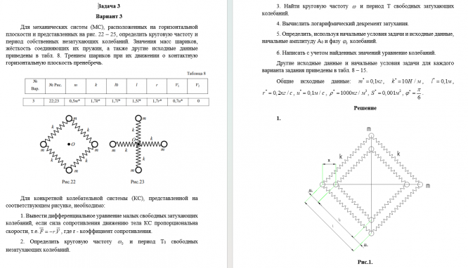 Задача 3 Вариант 3 Для механических систем (МС), расположенных на горизонтальной плоскости и представленных на рис. 22 – 25, определить круговую частоту и период собственных незатухающих колебаний. Значения масс шариков, жёсткость соединяющих их пружин, а также другие исходные данные приведены в табл. 8. Трением шариков при их движении о контактную горизонтальную плоскость пренебречь. Для конкретной колебательной системы (КС), представленной на соответствующем рисунке, необходимо: 1. Вывести дифференциальное уравнение малых свободных затухающих колебаний, если сила сопротивления движению тела КС пропорциональна скорости, т.е., где r - коэффициент сопротивления.