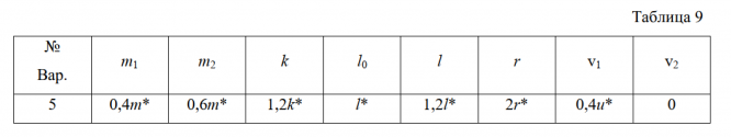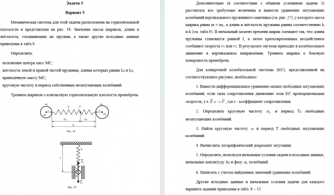 Задача 3 Вариант 5 Механическая система для этой задачи расположена на горизонтальной плоскости и представлена на рис. 18. Значения массы шариков, длина и жёсткость, соединяющих их пружин, а также другие исходные данные приведены в табл.9. Определить: положение центра масс МС; жёсткость левой и правой частей пружины, длины которых равны l10 и l20; приведённую массу МС; круговую частоту и период собственных незатухающих колебаний. Трением шариков о контактную горизонтальную плоскость пренебречь. Дополнительно (в соответствии с общими условиями задачи 3) рассчитать все требуемые величины и вывести уравнение затухающих колебаний вертикального пружинного маятника (см.