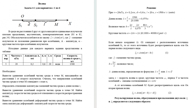 Оба излучателя колеблются по закону , где - смещение излучателя из положения равновесия при колебаниях, A - амплитуда, ω - круговая частота при колебаниях излучателя. Исходные данные для каждого варианта задания представлены в таблице  № вар Частота  υ кГц Амплитуда А, мм d, м l, м Среда Скорость волны в среде с, м/с 5 20 0,2 0,6 20 вода 1500   Необходимо: Вывести уравнение колебаний частиц среды в точке М, находящейся на расстоянии l от второго излучателя. Считать, что направления колебаний частиц среды в точке М совпадают с осью x; Определить отношение амплитуды смещений частиц среды к длине волны l; Вывести уравнение колебаний скорости частиц среды в точке М.