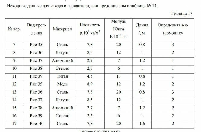 № вар. | Вид крепления | Материал | Плотность ρ, 103 кг/м3 | Модуль Юнга Е, 1010Па | Длина l, м | Определить i-ю гармонику |
