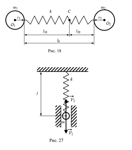 рис. 27), у которого масса шарика равна m = m 1 , а длина и жёсткость пружины равны соответственно l 0   и k (см. табл.9). В начальный момент времени шарик смещают так, что длина пружины становится равной l, а затем кратковременным воздействием сообщают скорость v 1  или v 2 . В результате система приходит в колебательное движение в вертикальном направлении. Трением шарика о боковую поверхность пренебречь. Для конкретной колебательной системы (КС), представленной на соответствующем рисунке, необходимо: 1. Вывести дифференциальное уравнение малых свободных затухающих колебаний, если сила сопротивления движению тела КС пропорциональна скорости, т.е., где r - коэффициент сопротивления.