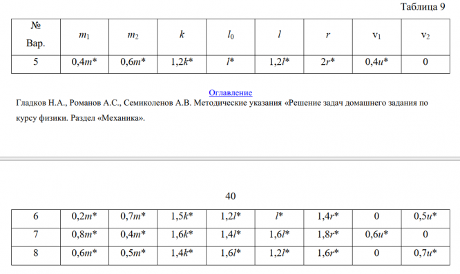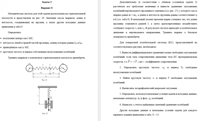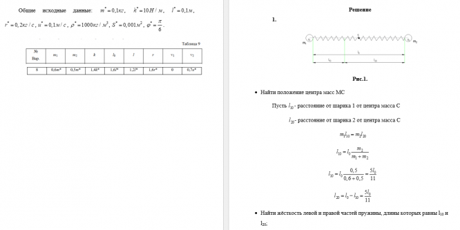 Задача 3 Вариант 8 Механическая система для этой задачи расположена на горизонтальной плоскости и представлена на рис. 18. Значения массы шариков, длина и жёсткость, соединяющих их пружин, а также другие исходные данные приведены в табл.9. Определить: положение центра масс МС; жёсткость левой и правой частей пружины, длины которых равны l10 и l20; приведённую массу МС; круговую частоту и период собственных незатухающих колебаний. Трением шариков о контактную горизонтальную плоскость пренебречь. Дополнительно (в соответствии с общими условиями задачи 3) рассчитать все требуемые величины и вывести уравнение затухающих колебаний вертикального пружинного маятника (см.