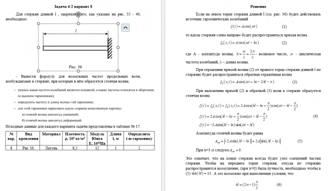 2. Определить круговую частоту  и период T 0  свободных незатухающих колебаний. 3. Найти круговую частоту  и период T свободных затухающих колебаний. 4. Вычислить логарифмический декремент затухания. 5. Определить, используя начальные условия задачи и исходные данные, начальные амплитуду A 0  и фазу  колебаний. 6. Написать с учетом найденных значений уравнение колебаний. Другие исходные данные и начальные условия задачи для каждого варианта задания приведены в табл. 8 – 15. ---------------------------------------------------------------------------------------- Задача 4-2 вариант 8 Для стержня длиной l , закреплённого, как указано на рис. 35 - 40, необходимо: - Вывести формулу для возможных частот продольных волн, возбуждаемых в стержне, при которых в нём образуется стоячая волна; Исходные данные для каждого варианта задачи представлены в таблице № 17..