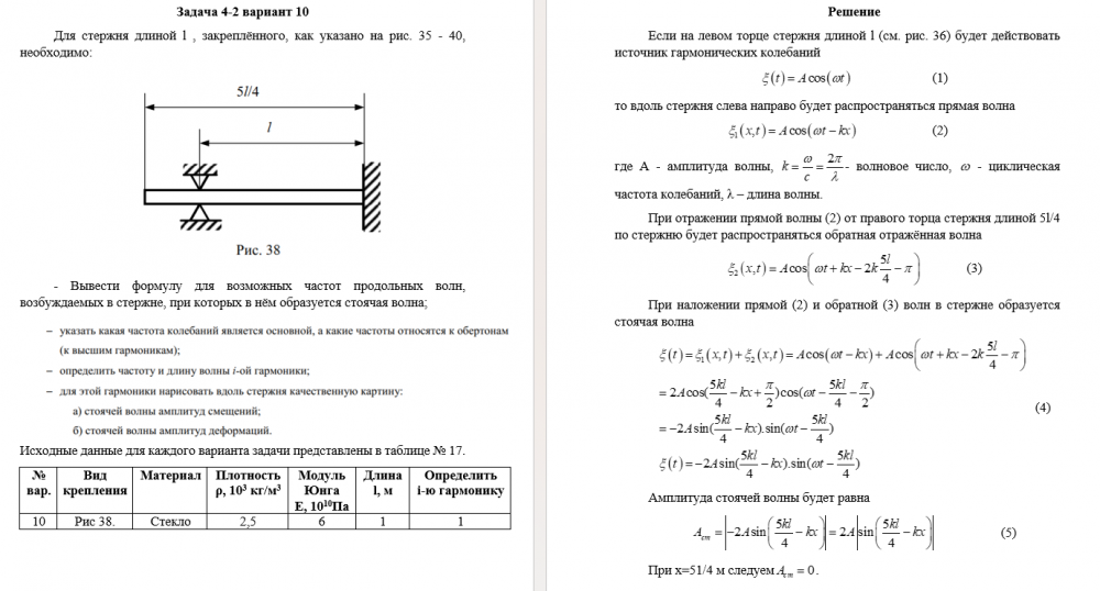 3. Найти круговую частоту и период T свободных затухающих колебаний. 4. Вычислить логарифмический декремент затухания. 5. Определить, используя начальные условия задачи и исходные данные, начальные амплитуду A 0 и фазу колебаний. 6. Написать с учетом найденных значений уравнение колебаний. ---------------------------------------------------------------------------------------- Задача 4-2 вариант 10 Для стержня длиной l , закреплённого, как указано на рис. 35 - 40, необходимо: - Вывести формулу для возможных частот продольных волн, возбуждаемых в стержне, при которых в нём образуется стоячая волна; Исходные данные для каждого варианта задачи представлены в таблице № 17..