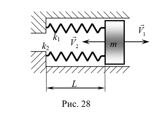 Каждая колебательная система (КС), представленная на рис. 28, 29, 30, 31, состоит из шайбы массой m и двух упругих пружин, имеющих жесткости k1 и k2. Движение КС происходит в окружающей среде с малыми вязкими свойствами (малым коэффициентом сопротивления r). На рис. 28, 30 шайба колеблется под действием пружин, соединенных параллельно, а на рис.29, 31 колебания происходят под действием пружин, соединенных последовательно. Массой пружин можно пренебречь. На рис. 28, 29 КС имеет горизонтальное расположение, а на рис. 30, 31 вертикальное расположение в поле силы тяжести. Длины 1-ой и 2-ой пружин в недеформированных состояниях равны l10 и l20. На рис.28, 30 L - длина каждой пружины в деформированном состоянии при t=0. На рис.29, 31 L - общая длина двух пружин в деформированном состоянии при t=0. Возможные векторы начальной скорости шайбы равны V1, V2. Шайбу, находящуюся в положении равновесия, смещают до расстояния L, а затем импульсом придают ей в начальный момент времени t=0 скорость V1 или V2, в соответствии с заданием (см. таблицы №10-13). В результате КС приходит в колебательное движение.