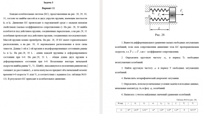 Задача 3 Вариант 11 Каждая колебательная система (КС), представленная на рис. 28, 29, 30, 31, состоит из шайбы массой m и двух упругих пружин, имеющих жесткости k 1  и k 2 . Движение КС происходит в окружающей среде с малыми вязкими свойствами (малым коэффициентом сопротивления r). На рис. 28, 30 шайба колеблется под действием пружин, соединенных параллельно, а на рис.29, 31 колебания происходят под действием пружин, соединенных последовательно. Массой пружин можно пренебречь. На рис. 28, 29 КС имеет горизонтальное расположение, а на рис. 30, 31 вертикальное расположение в поле силы тяжести. Длины 1-ой и 2-ой пружин в недеформированных состояниях равны l 10  и l 20 .