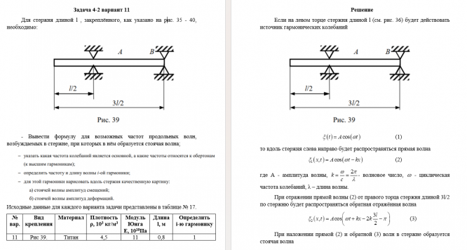 № вар. Вид крепления Материал Плотность ρ , 103 кг/м3 Модуль Юнга Е, 1010Па Длина l,  м Определить i- ю гармонику 11 Рис 39. Титан 4,5 11 0,8 1                                                          Решение Если на левом торце стержня длиной l (см. рис. 36) будет действовать источник гармонических колебаний                       (1) то вдоль стержня слева направо будет распространяться прямая волна                      (2) где A - амплитуда волны, - волновое число,  - циклическая частота колебаний, λ – длина волны. При отражении прямой волны (2) от правого торца стержня длиной 3l/2 по стержню будет распространяться обратная отражённая волна .