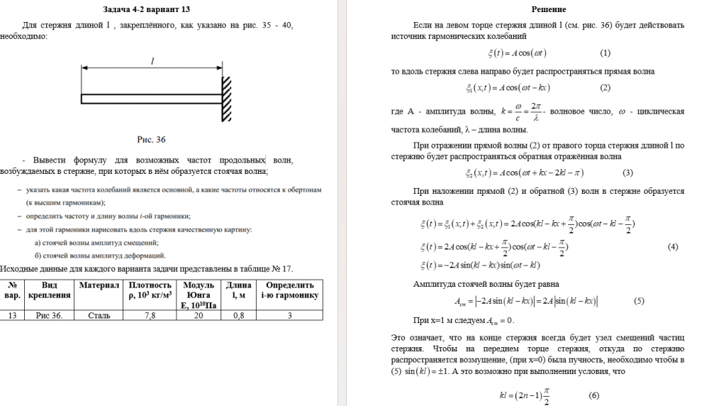 3. Найти круговую частоту и период T свободных затухающих колебаний. 4. Вычислить логарифмический декремент затухания. 5. Определить, используя начальные условия задачи и исходные данные, начальные амплитуду A 0 и фазу колебаний. ---------------------------------------------------------------------------------------- Задача 4-2 вариант 10 Для стержня длиной l , закреплённого, как указано на рис. 35 - 40, необходимо: - Вывести формулу для возможных частот продольных волн, возбуждаемых в стержне, при которых в нём образуется стоячая волна; - указать какая частота колебаний является основной, а какие частоты относятся к обертонам (к высшим гармоникам); - определить частоту и длину волны i-ой гармоники; -для этой гармоники нарисовать вдоль стержня качественную картину: а) стоячей волны амплитуд смещений; б) стоячей волны амплитуд деформаций.