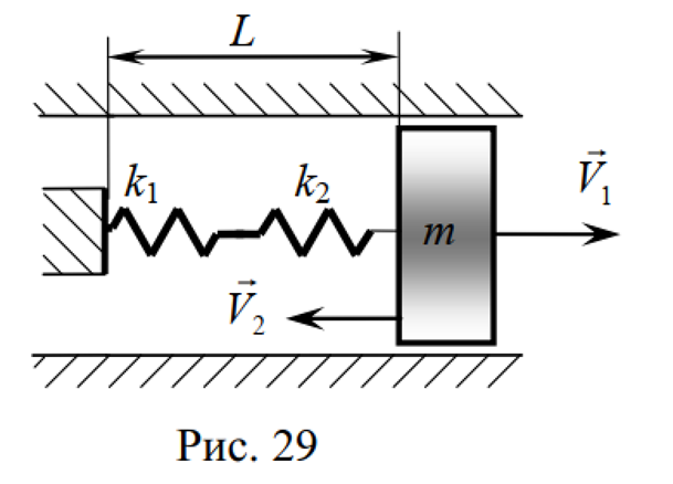 Каждая колебательная система (КС), представленная на рис. 28, 29, 30, 31, состоит из шайбы массой m и двух упругих пружин, имеющих жесткости k1 и k2. Движение КС происходит в окружающей среде с малыми вязкими свойствами (малым коэффициентом сопротивления r). На рис. 28, 30 шайба колеблется под действием пружин, соединенных параллельно, а на рис.29, 31 колебания происходят под действием пружин, соединенных последовательно. Массой пружин можно пренебречь. На рис. 28, 29 КС имеет горизонтальное расположение, а на рис. 30, 31 вертикальное расположение в поле силы тяжести. Длины 1-ой и 2-ой пружин в недеформированных состояниях равны l10 и l20. На рис.28, 30 L - длина каждой пружины в деформированном состоянии при t=0. На рис.29, 31 L - общая длина двух пружин в деформированном состоянии при t=0. Возможные векторы начальной скорости шайбы равны V1, V2. Шайбу, находящуюся в положении равновесия, смещают до расстояния L, а затем импульсом придают ей в начальный момент времени t=0 скорость V1 или V2, в соответствии с заданием (см. таблицы №10-13). В результате КС приходит в колебательное движение.