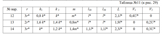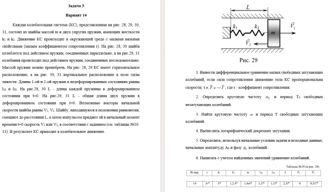 Задача 3 Вариант 14 Каждая колебательная система (КС), представленная на рис. 28, 29, 30, 31, состоит из шайбы массой m и двух упругих пружин, имеющих жесткости k 1  и k 2 . Движение КС происходит в окружающей среде с малыми вязкими свойствами (малым коэффициентом сопротивления r). На рис. 28, 30 шайба колеблется под действием пружин, соединенных параллельно, а на рис.29, 31 колебания происходят под действием пружин, соединенных последовательно. Массой пружин можно пренебречь. На рис. 28, 29 КС имеет горизонтальное расположение, а на рис. 30, 31 вертикальное расположение в поле силы тяжести. Длины 1-ой и 2-ой пружин в недеформированных состояниях равны l 10  и l 20 .
