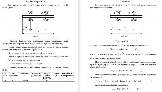 3. Найти круговую частоту  и период T свободных затухающих колебаний. 4. Вычислить логарифмический декремент затухания. 5. Определить, используя начальные условия задачи и исходные данные, начальные амплитуду A 0  и фазу  колебаний. 6. Написать с учетом найденных значений уравнение колебаний. ---------------------------------------------------------------------------------------- Задача 4-2 вариант 10 Для стержня длиной l , закреплённого, как указано на рис. 35 - 40, необходимо:   - Вывести формулу для возможных частот продольных волн, возбуждаемых в стержне, при которых в нём образуется стоячая волна; - указать какая частота колебаний является основной, а какие частоты относятся к обертонам (к высшим гармоникам); - определить частоту и длину волны i-ой гармоники; -для этой гармоники нарисовать вдоль стержня качественную картину: а) стоячей волны амплитуд смещений; б) стоячей волны амплитуд деформаций.