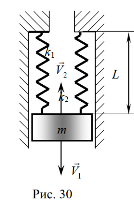 Каждая колебательная система (КС), представленная на рис. 28, 29, 30, 31, состоит из шайбы массой m и двух упругих пружин, имеющих жесткости k1 и k2. Движение КС происходит в окружающей среде с малыми вязкими свойствами (малым коэффициентом сопротивления r). На рис. 28, 30 шайба колеблется под действием пружин, соединенных параллельно, а на рис.29, 31 колебания происходят под действием пружин, соединенных последовательно. Массой пружин можно пренебречь. На рис. 28, 29 КС имеет горизонтальное расположение, а на рис. 30, 31 вертикальное расположение в поле силы тяжести. Длины 1-ой и 2-ой пружин в недеформированных состояниях равны l10 и l20. На рис.28, 30 L - длина каждой пружины в деформированном состоянии при t=0. На рис.29, 31 L - общая длина двух пружин в деформированном состоянии при t=0. Возможные векторы начальной скорости шайбы равны V1, V2. Шайбу, находящуюся в положении равновесия, смещают до расстояния L, а затем импульсом придают ей в начальный момент времени t=0 скорость V1 или V2, в соответствии с заданием (см. таблицы №10-13). В результате КС приходит в колебательное движение.
