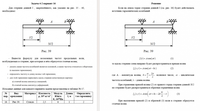 3. Найти круговую частоту  и период T свободных затухающих колебаний. 4. Вычислить логарифмический декремент затухания. 5. Определить, используя начальные условия задачи и исходные данные, начальные амплитуду A 0  и фазу  колебаний. 6. Написать с учетом найденных значений уравнение колебаний ---------------------------------------------------------------------------------------- Задача 4-2 вариант 16 Для стержня длиной l , закреплённого, как указано на рис. 35 - 40, необходимо:   - Вывести формулу для возможных частот продольных волн, возбуждаемых в стержне, при которых в нём образуется стоячая волна; - указать какая частота колебаний является основной, а какие частоты относятся к обертонам (к высшим гармоникам); - определить частоту и длину волны i-ой гармоники; -для этой гармоники нарисовать вдоль стержня качественную картину: а) стоячей волны амплитуд смещений; б) стоячей волны амплитуд деформаций.
