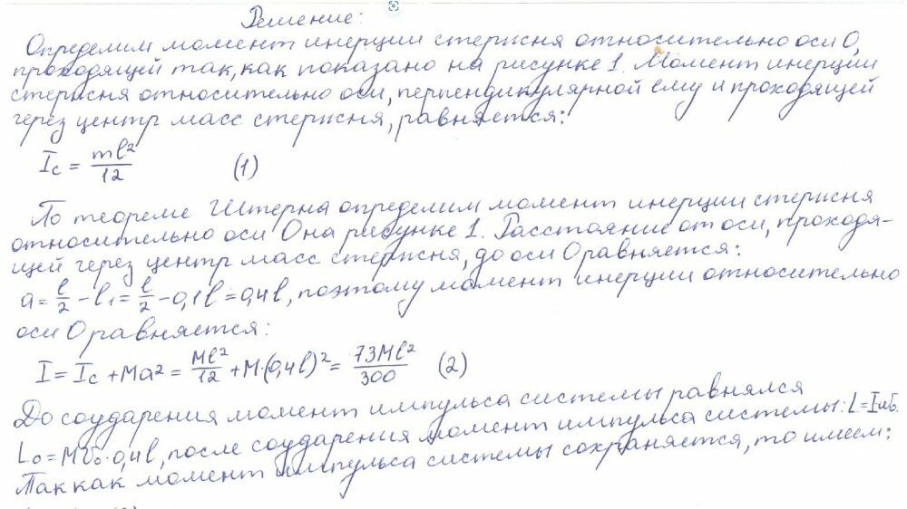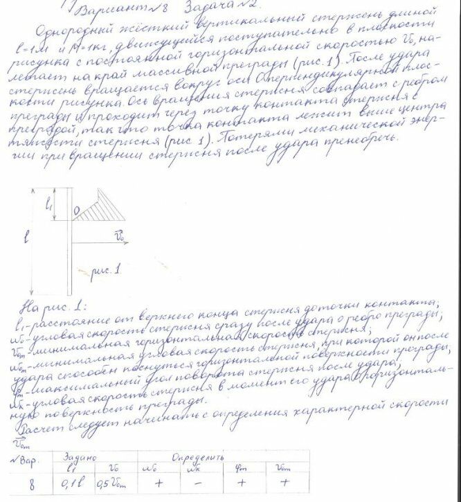 V0m – минимальная горизонтальная скорость стержня, а ω0m – соответственно минимальная угловая скорость стержня, при которой он после удара способен коснуться горизонтальной поверхности преграды;