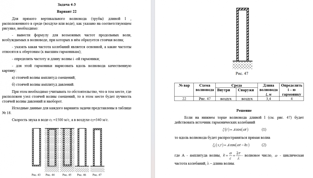 2. Определить круговую частоту  и период T0 свободных незатухающих колебаний. 3. Найти круговую частоту  и период T свободных затухающих колебаний. 4. Вычислить логарифмический декремент затухания. 5. Определить, используя начальные условия задачи и исходные данные, начальные амплитуду A0 и фазу  колебаний. 6. Написать с учетом найденных значений уравнение колебаний. Задача 4-3 Вариант 22 Для прямого вертикального волновода (трубы) длиной l , расположенного в среде (воздухе или воде), как указано на соответствующем рисунке, необходимо: - вывести формулу для возможных частот продольных волн, возбуждаемых в волноводе, при которых в нём образуется стоячая волна; - указать какая частота колебаний является основной, а какие частоты относятся к обертонам (к высшим гармоникам); - определить частоту и длину волны i -ой гармоники; - для этой гармоники нарисовать вдоль волновода качественную картину: a) стоячей волны амплитуд смещений; б) стоячей волны амплитуд давлений.