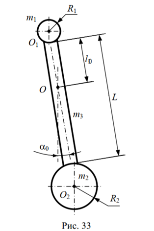 На рис. 33 представлен физический маятник (ФМ), состоящий из двух шаров радиусами R1 и R2, и массами соответственно m1 и m2. Шары жёстко скреплены с помощью стержня длиной L и массой m3. Через т. О стержня проходит горизонтальная ось вращения ФМ, расположенная на расстоянии l0 от верхнего конца стержня, так что ФМ может совершать вращательное движение в вертикальной плоскости. ФМ, находящийся в положении равновесия, отклоняют на угол (см. таблицу № 15), а затем в начальный момент времени отпускают.