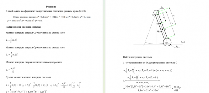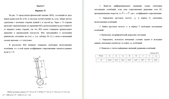 Задача 3 Вариант 25 На рис. 33 представлен физический маятник (ФМ), состоящий из двух шаров радиусами R1 и R2, и массами соответственно m1 и m2. Шары жёстко скреплены с помощью стержня длиной L и массой m3. Через т. О стержня проходит горизонтальная ось вращения ФМ, расположенная на расстоянии l0 от верхнего конца стержня, так что ФМ может совершать вращательное движение в вертикальной плоскости. ФМ, находящийся в положении равновесия, отклоняют на угол (см. таблицу № 15), а затем в начальный момент времени отпускают. В результате ФМ начинает совершать свободные незатухающие колебания, т.е. в этой задаче коэффициент сопротивления считается равным нулю (r = 0).