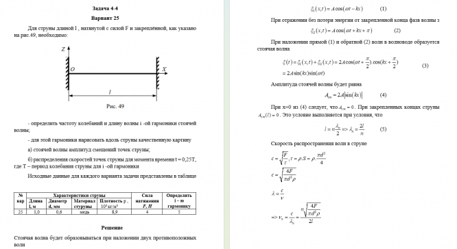 1. Вывести дифференциальное уравнение малых свободных затухающих колебаний, если сила сопротивления движению тела КС пропорциональна скорости, т.е. , где r - коэффициент сопротивления. 2. Определить круговую частоту и период T0 свободных незатухающих колебаний. 3. Найти круговую частоту и период T свободных затухающих колебаний. 4. Вычислить логарифмический декремент затухания. 5. Определить, используя начальные условия задачи и исходные данные, начальные амплитуду A0 и фазу колебаний. 6. Написать с учетом найденных значений уравнение колебаний. Задача 4-4 Вариант 25 Для струны длиной l , натянутой с силой F и закреплённой, как указано на рис.49, необходимо: - определить частоту колебаний и длину волны i -ой гармоники стоячей волны; - для этой гармоники нарисовать вдоль струны качественную картину a) стоячей волны амплитуд смещений точек струны; б) распределения скоростей точек струны для момента времени t = 0,25T, где T – период колебания струны для i -ой гармоники Исходные данные для каждого варианта задачи представлены в таблице № вар Характеристики струны Сила натяжения F, Н Определить i – ю гармонику Длина l, м Диаметр d, мм Материал стуруны Плотность р , 103 кг/м3 25 1,0 0,6 медь 8,9 4 5 .