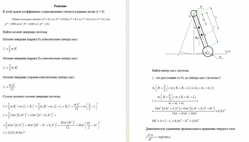 Задача 3 Вариант 28 На рис. 33 представлен физический маятник (ФМ), состоящий из двух шаров радиусами R1 и R2, и массами соответственно m1 и m2. Шары жёстко скреплены с помощью стержня длиной L и массой m3. Через т. О стержня проходит горизонтальная ось вращения ФМ, расположенная на расстоянии l0 от верхнего конца стержня, так что ФМ может совершать вращательное движение в вертикальной плоскости. ФМ, находящийся в положении равновесия, отклоняют на угол   (см. таблицу № 15), а затем в начальный момент времени   отпускают. В результате ФМ начинает совершать свободные незатухающие колебания, т.е. в этой задаче коэффициент сопротивления считается равным нулю (r = 0).