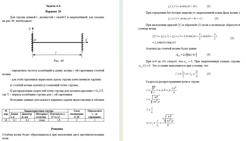 1. Вывести дифференциальное уравнение малых свободных затухающих колебаний, если сила сопротивления движению тела КС пропорциональна скорости, т.е. , где r - коэффициент сопротивления. 2. Определить круговую частоту   и период T0 свободных незатухающих колебаний. 3. Найти круговую частоту   и период T свободных затухающих колебаний. 4. Вычислить логарифмический декремент затухания. 5. Определить, используя начальные условия задачи и исходные данные, начальные амплитуду A0 и фазу   колебаний. 6. Написать с учетом найденных значений уравнение колебаний. Задача 4-4 Вариант 2 8 Для струны длиной l , натянутой с силой F и закреплённой, как указано на рис.49, необходимо: - определить частоту колебаний и длину волны i -ой гармоники стоячей волны; - для этой гармоники нарисовать вдоль струны качественную картину a) стоячей волны амплитуд смещений точек струны; б) распределения скоростей точек струны для момента времени t = 0,25T, где T – период колебания струны для i -ой гармоники Исходные данные для каждого варианта задачи представлены в таблице    № вар Характеристики струны Сила натяжения F,  Н Определить  i –  ю гармонику Длина  l,  м Диаметр  d,  мм Материал стуруны Плотность   р ,  103   кг/м3 28 0,7 0,1 сталь 7,8 2 .