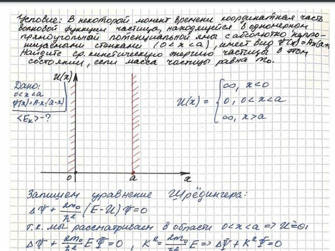6.1.05. В некоторый момент времени координатная часть волновой функции частицы, находящейся в одномерной прямоугольной потенциальной яме с абсолютно непроницаемыми стенками ( 0  x  a ), имеет вид x  Axa  x . Найдите среднюю кинетическую энергию частицы в этом состоянии, если масса частицы равна m0