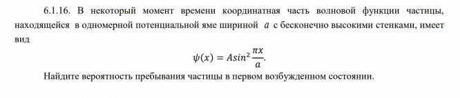 6.1.16. В некоторый момент времени координатная часть волновой функции частицы, находящейся в одномерной потенциальной яме шириной a с бесконечно высокими стенками, имеет вид 𝜓(𝑥) = 𝐴𝑠𝑖𝑛2 𝜋𝑥 𝑎 . Найдите вероятность пребывания частицы в первом возбужденном состоянии.