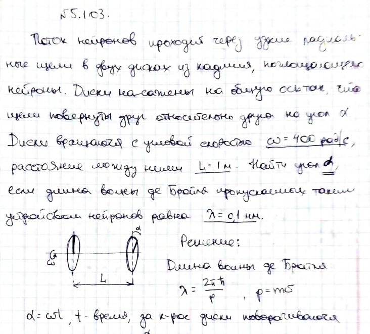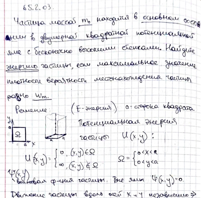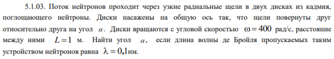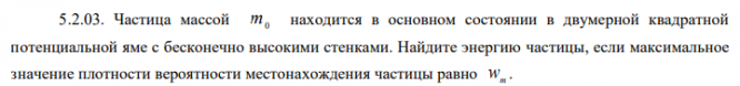 Поток нейтронов проходит через узкие радиальные щели в двух дисках из кадмия, поглощающего нейтроны. Диски насажены на общую ось так, что щели повернуты друг относительно друга на угол  . Частица массой m0 находится в основном состоянии в двумерной квадратной потенциальной яме с бесконечно высокими стенками. Найдите энергию частицы, если максимальное значение плотности вероятности местонахождения частицы равно .