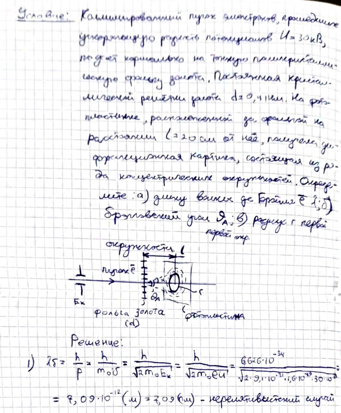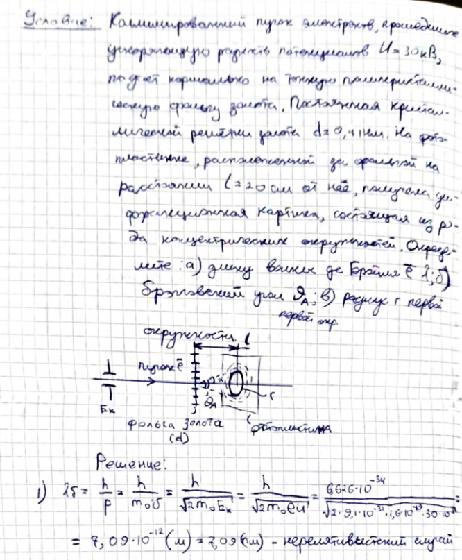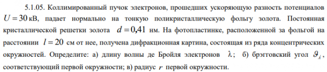 Коллимированный пучок электронов, прошедших ускоряющую разность потенциалов U 30 кВ, падает нормально на тонкую поликристаллическую фольгу золота. Постоянная кристаллической решетки золота d 0,41 нм. Частица массой m0 находится в одномерном потенциальном поле Ux в стационарном состоянии, описываемом волновой функцией.