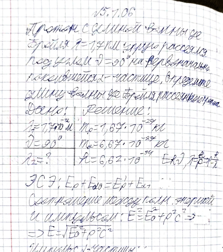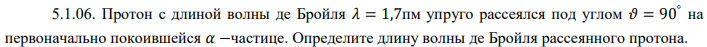 Протон с длиной волны де Бройля 𝜆 = 1,7пм упруго рассеялся под углом 𝜗 = 90° на первоначально покоившейся 𝛼 −частице. Определите длину волны де Бройля рассеянного протона..