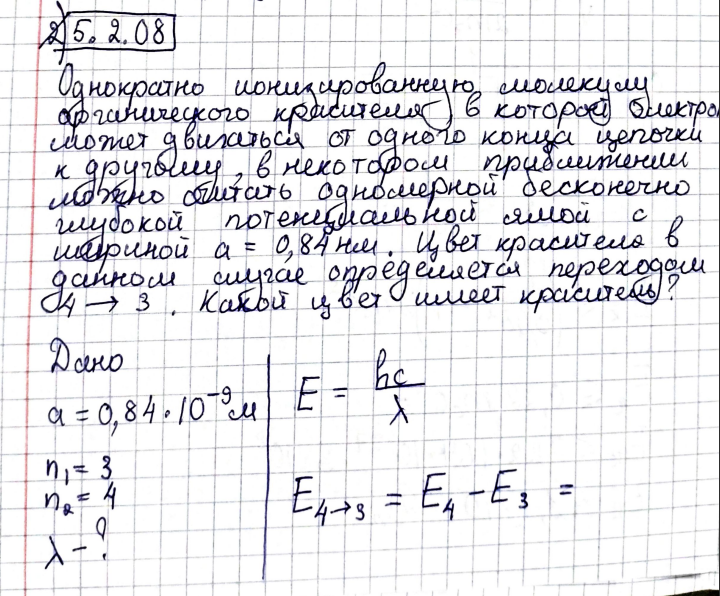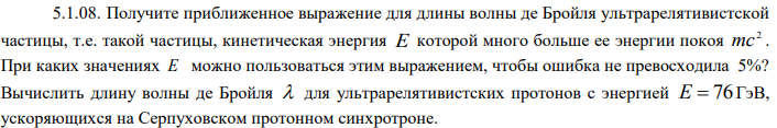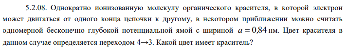 Получите приближенное выражение для длины волны де Бройля ультрарелятивистской частицы, т.е. такой частицы, кинетическая энергия E которой много больше ее энергии покоя. Однократно ионизованную молекулу органического красителя, в которой электрон может двигаться от одного конца цепочки к другому, в некотором приближении можно считать одномерной бесконечно глубокой потенциальной ямой с шириной a 0,84 нм..